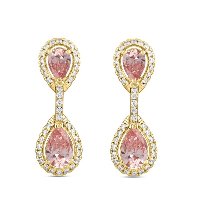 ETERNAL BLUSH COLLECTION LADIES EARRINGS 3 3/4CT ROUND/PEAR DIAMOND 14K YELLOW GOLD (CENTER STONE PINK PEAR DIAMOND 2CT)