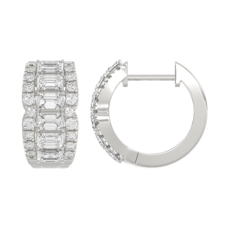 14K WHITE GOLD 1 3/4CT ROUND/EMERALD DIAMOND HOOP EARRINGS