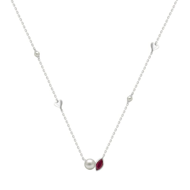 10K White Gold Ladies necklace 1/3CT featuring pearls, Round & heart-shaped charms, and Marquise pearl-shaped ruby accent