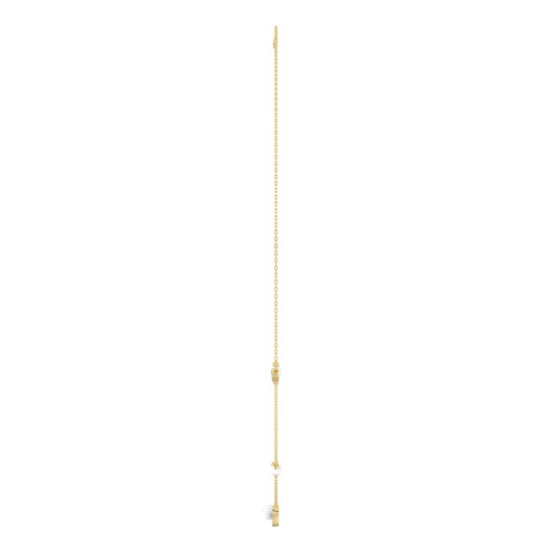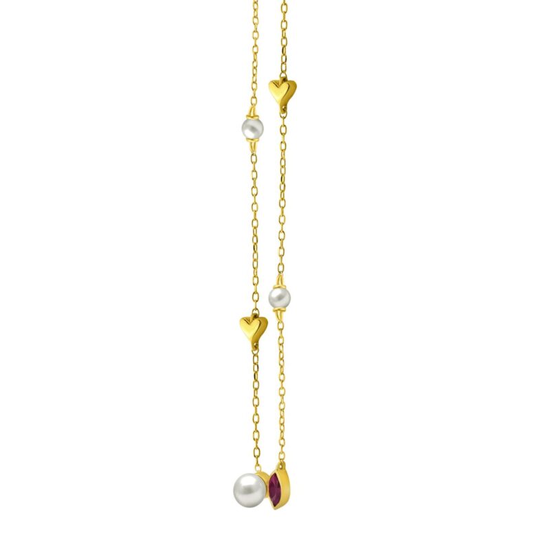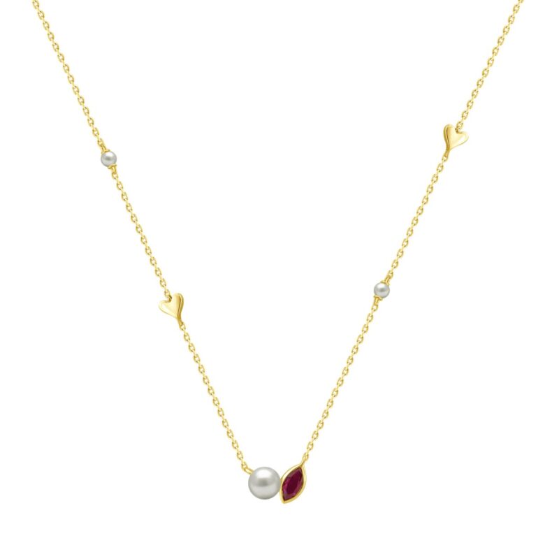 10K Yellow Gold Ladies necklace 1/3CT featuring pearls, Round & heart-shaped charms, and Marquise pearl-shaped ruby accent