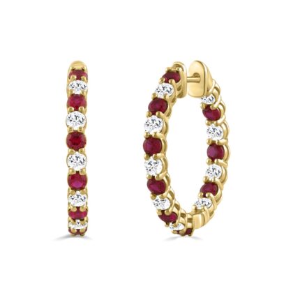 14K YELLOW GOLD 3 3/8CT ROUND/RUBY ROUND DIAMOND LADIES HOOPS EARRING