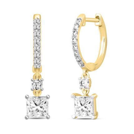 LADIES EARRINGS 1 1/4CT PRINCESS/ROUND DIAMOND 14K YELLOW GOLD (CENTER STONE PRINCESS DIAMOND 1CT)