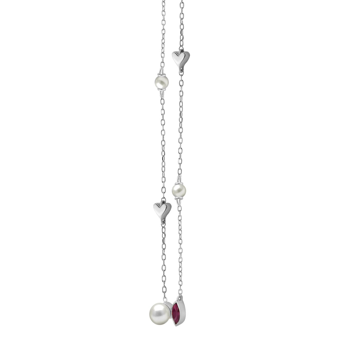 10K White Gold Ladies necklace 1/3CT featuring pearls, Round & heart-shaped charms, and Marquise pearl-shaped ruby accent