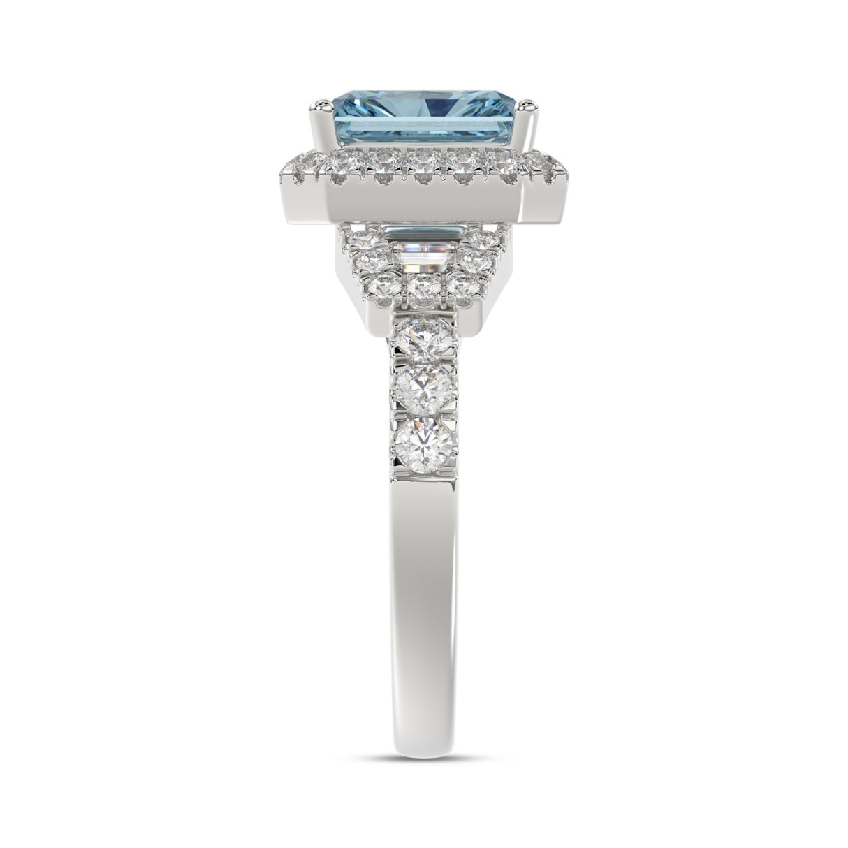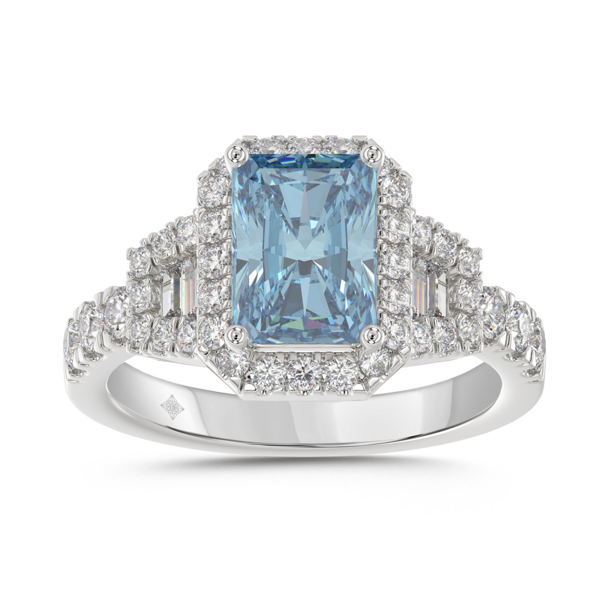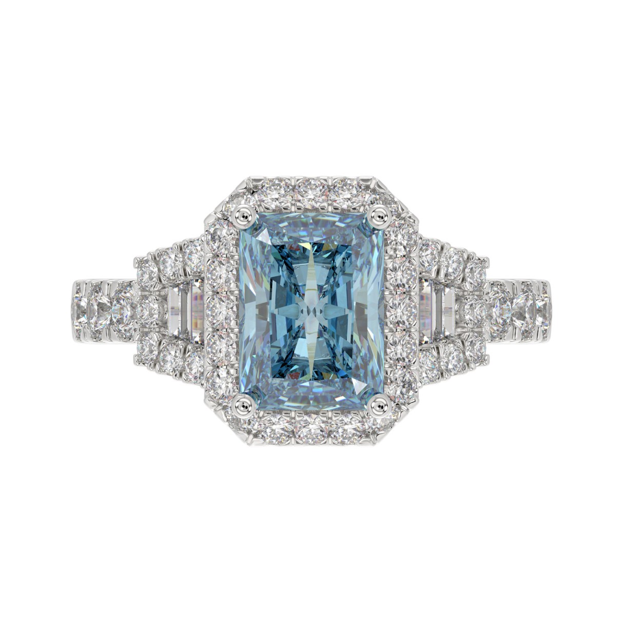 14K WHITE GOLD 2 3/4CT ROUND/BAGUETTE/RADIANT DIAMOND LADIES RING (CENTER STONE BLUE RADIANT DIAMOND 2.00CT)