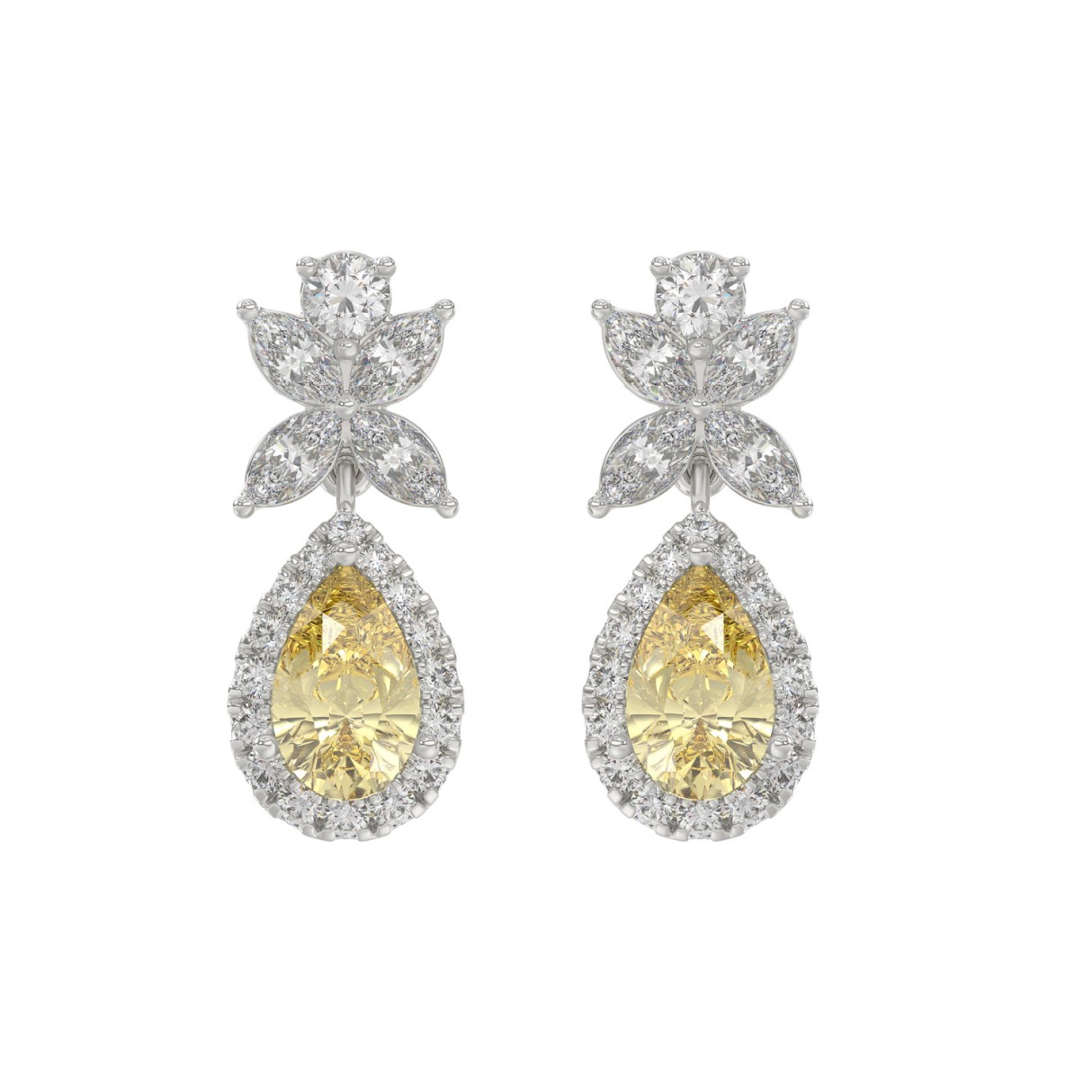 14K WHITE GOLD 3 1/2CT ROUND/YELLOW PEAR/MARQUISE DIAMOND LADIES EARRINGS