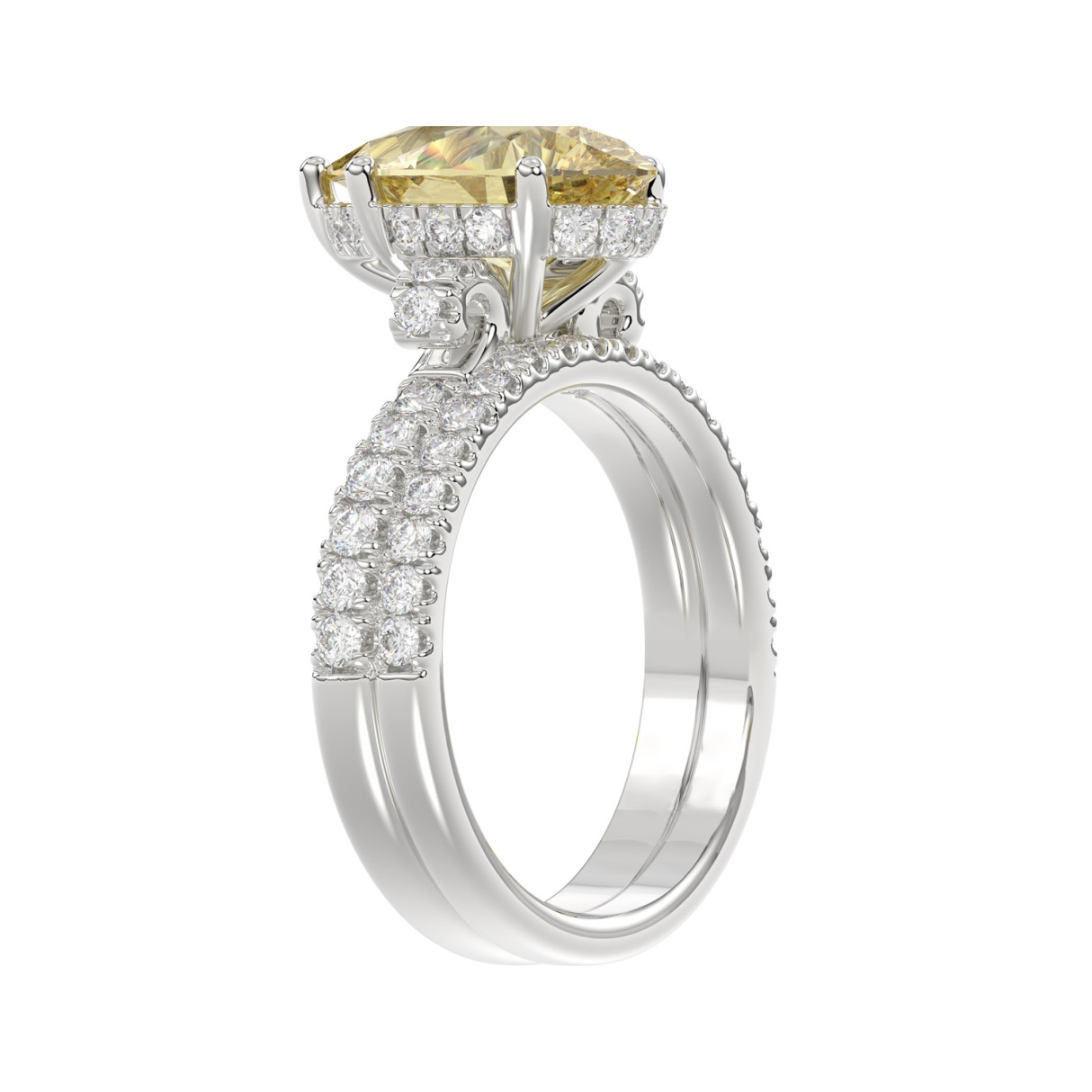 14K WHITE GOLD 3 3/4CT ROUND/CUSHION DIAMOND LADIES BRIDAL SET (CENTER STONE CUSHION YELLOW DIAMOND 3.00CT)
