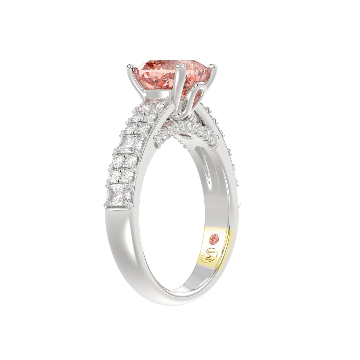 14K WHITE GOLD CRAFTED WITH 18K YELLOW GOLD SHANK 3.00CT ROUND/HALF MOON/EMERALD DIAMOND LADIES RING (CENTER STONE EMERALD PINK DIAMOND 2.00CT)