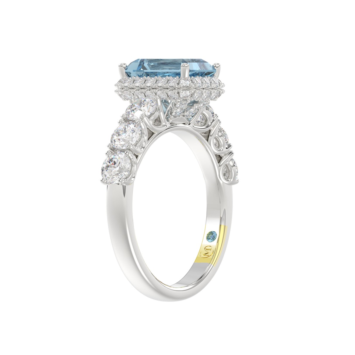 14K WHITE GOLD CRAFTED WITH 18K YELLOW GOLD SHANK 3 1/2CT ROUND/RADIANT DIAMOND LADIES RING (CENTER STONE RADIANT BLUE DIAMOND 2.00CT)