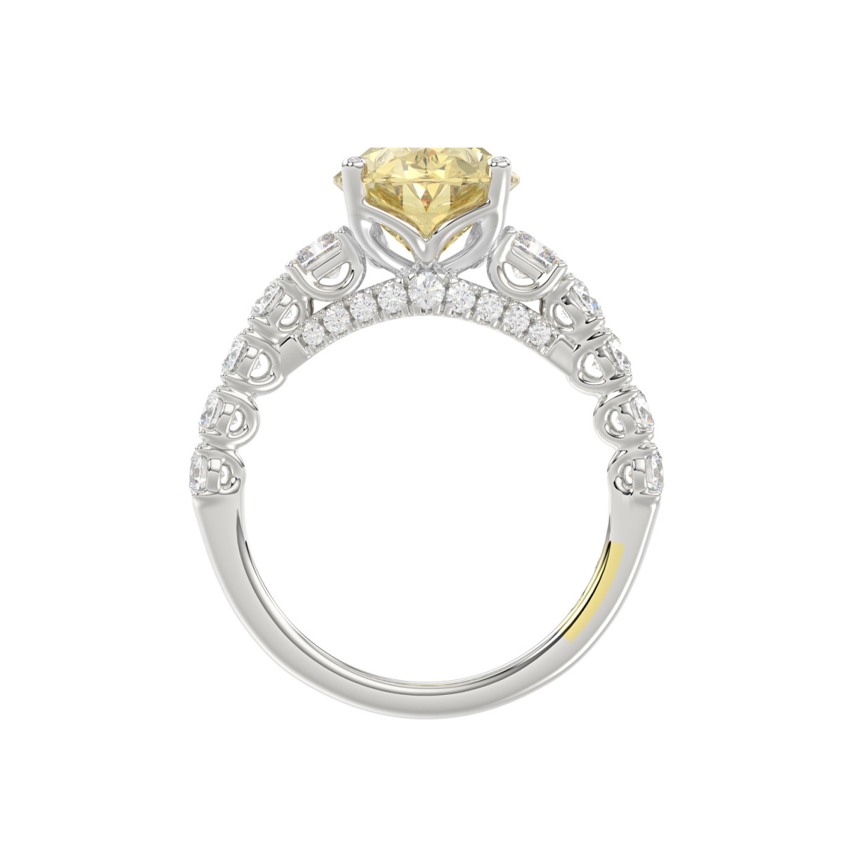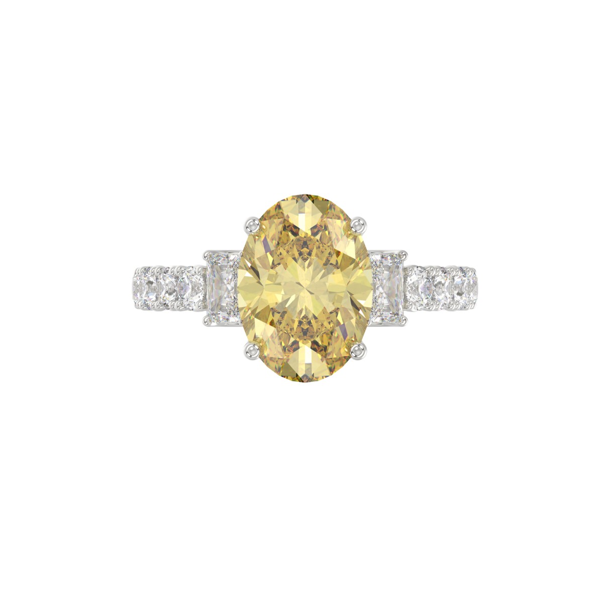 14K WHITE GOLD CRAFTED WITH 18K YELLOW GOLD SHANK 4 1/4CT ROUND/EMERALD/YELLOW OVAL DIAMOND LADIES RING (CENTER STONE OVAL YELLOW DIAMOND 3.00CT)