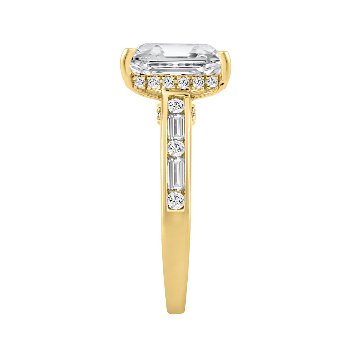 14K YELLOW GOLD 3 1/2CT ROUND/BAGUETTE/EMERALD DIAMOND LADIES RING (CENTER STONE EMERALD DIAMOND 3CT)