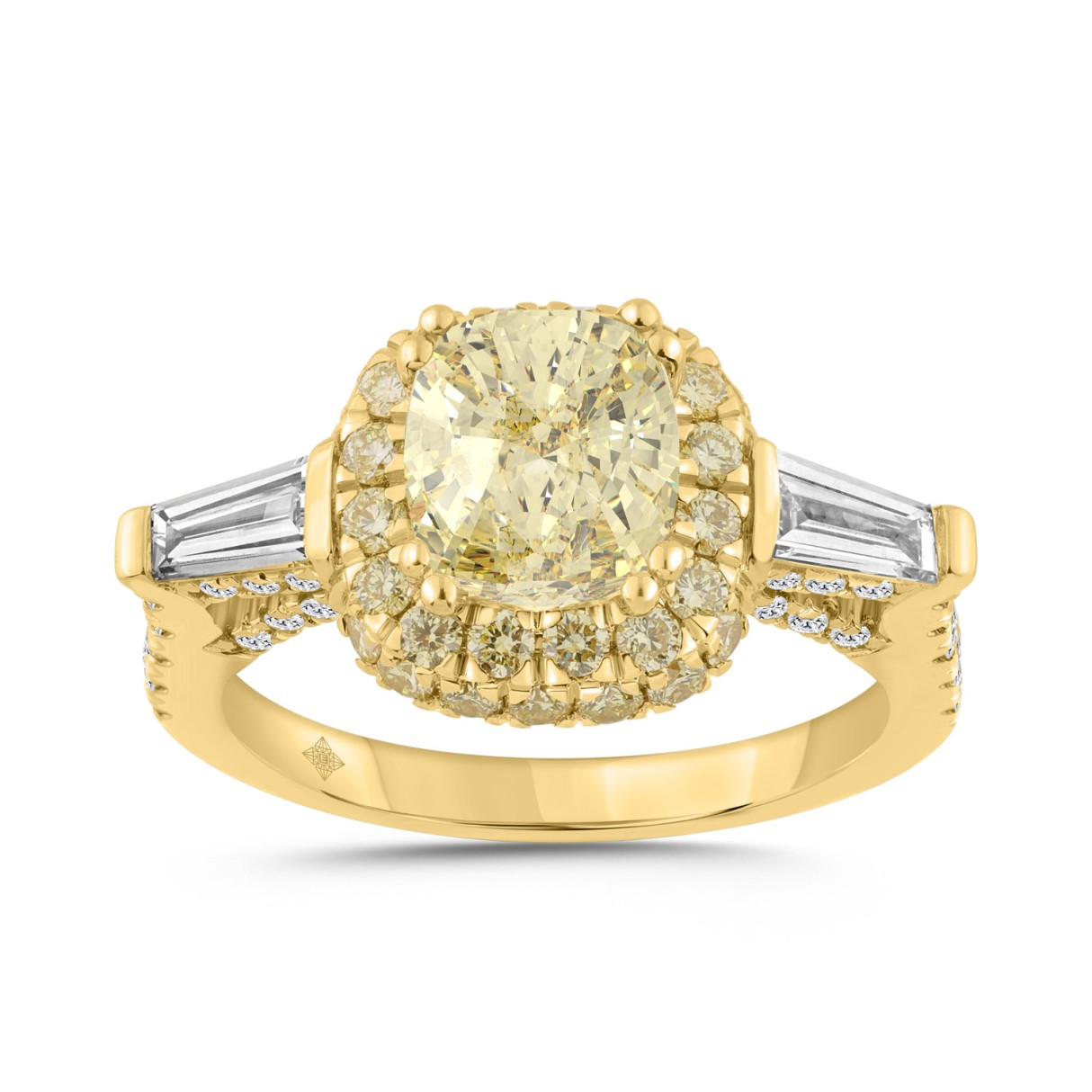 14K YELLOW GOLD 3 1/2CT ROUND/CUSHION/BAGUETTE DIAMOND LADIES RING (CENTER STONE YELLOW CUSHION DIAMOND 2CT)