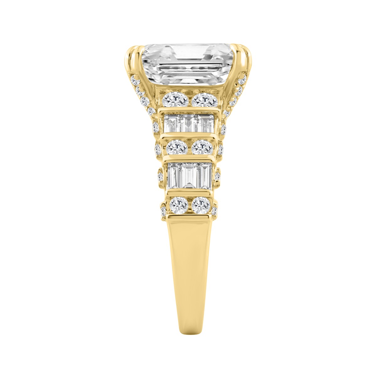 14K Yellow Gold Cushion Lab Grown Diamond Engagement Ring 5.00Ct With 4.00Ct Cushion Center Stone & Round/Baguette Side Stones (Color F-G Clarity Vs1/