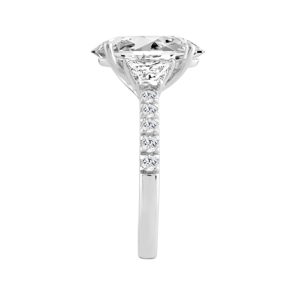 2 3/4Ct White Gold Oval Cut 14K Three-Stone Engagement Ring & Round With Trapezoid Side Stones 2.00Ct Oval Center Stone (Color F-G -Clarity Vs1/V
