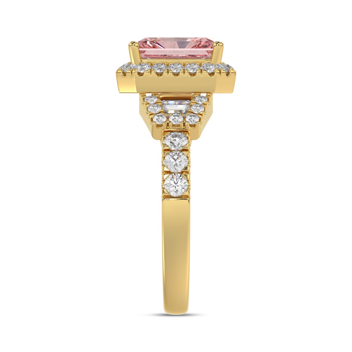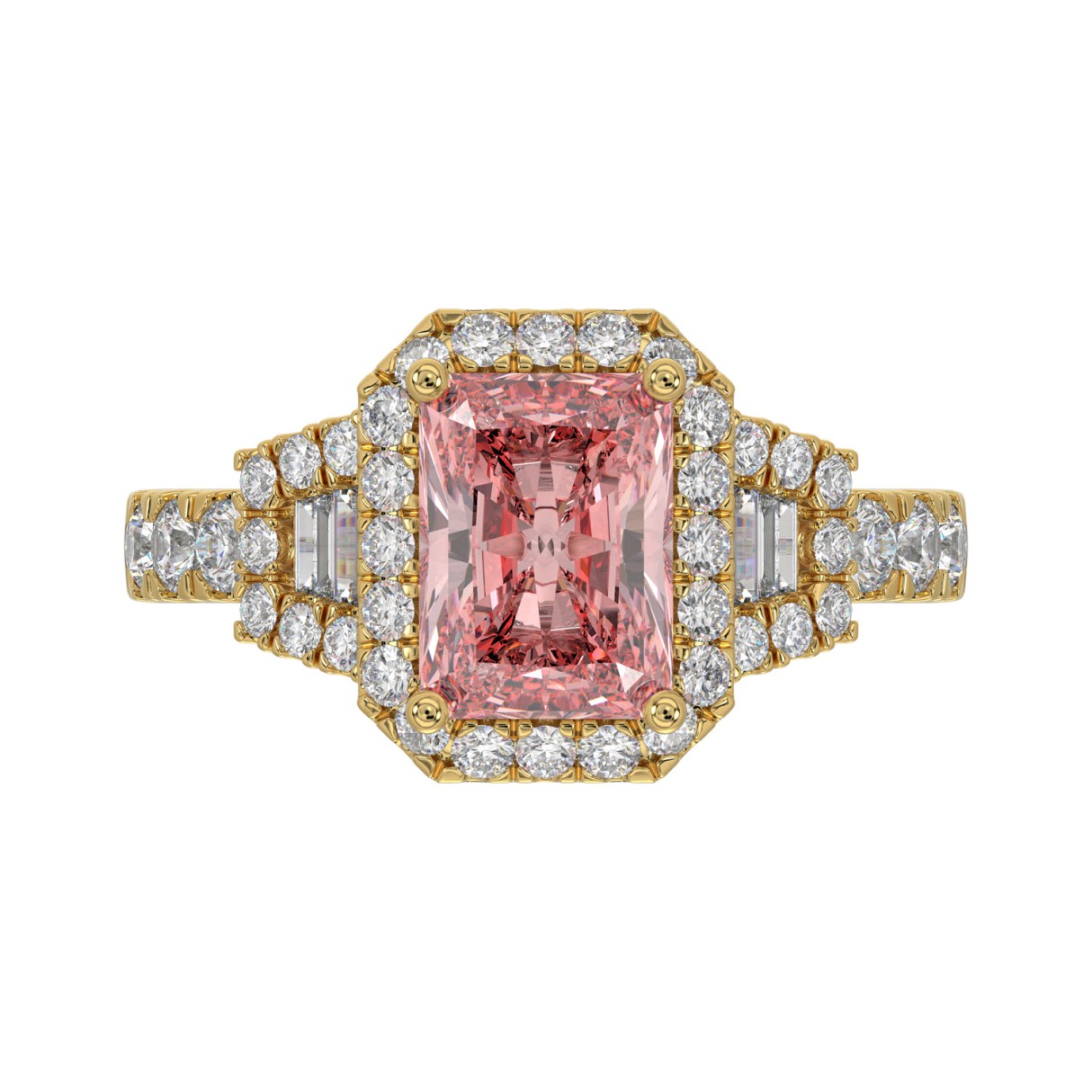ETERNAL BLUSH COLLECTION 14K YELLOW GOLD 2 3/4CT ROUND/BAGUETTE/RADIANT DIAMOND LADIES RING (CENTER STONE PINK RADIANT DIAMOND 2CT)
