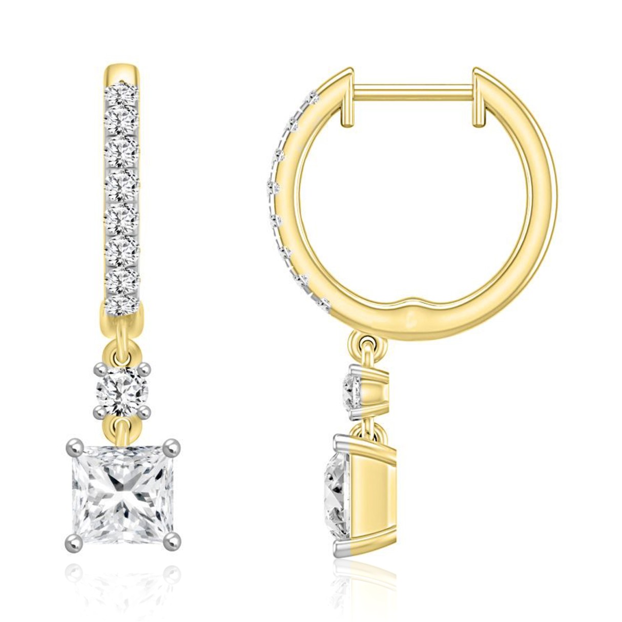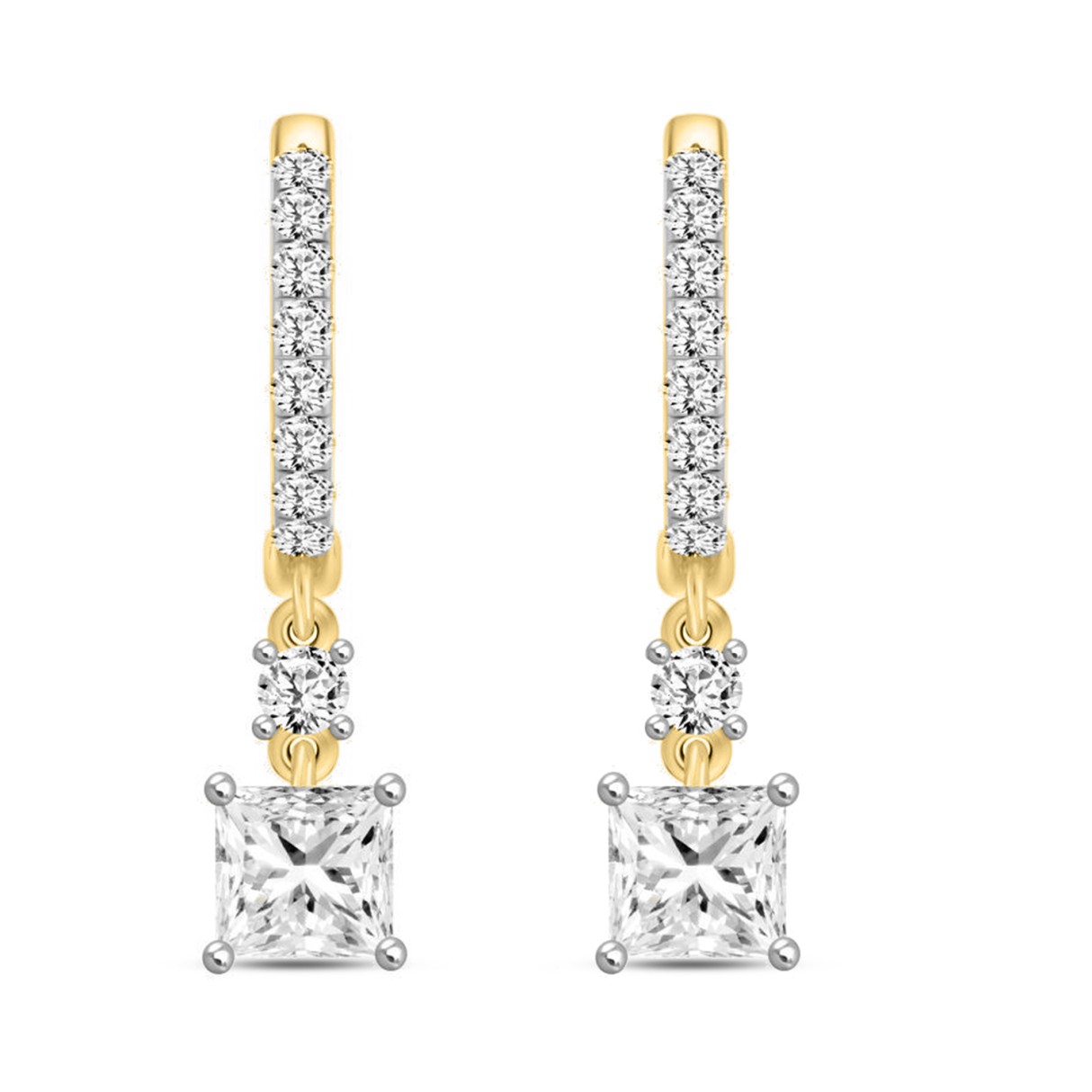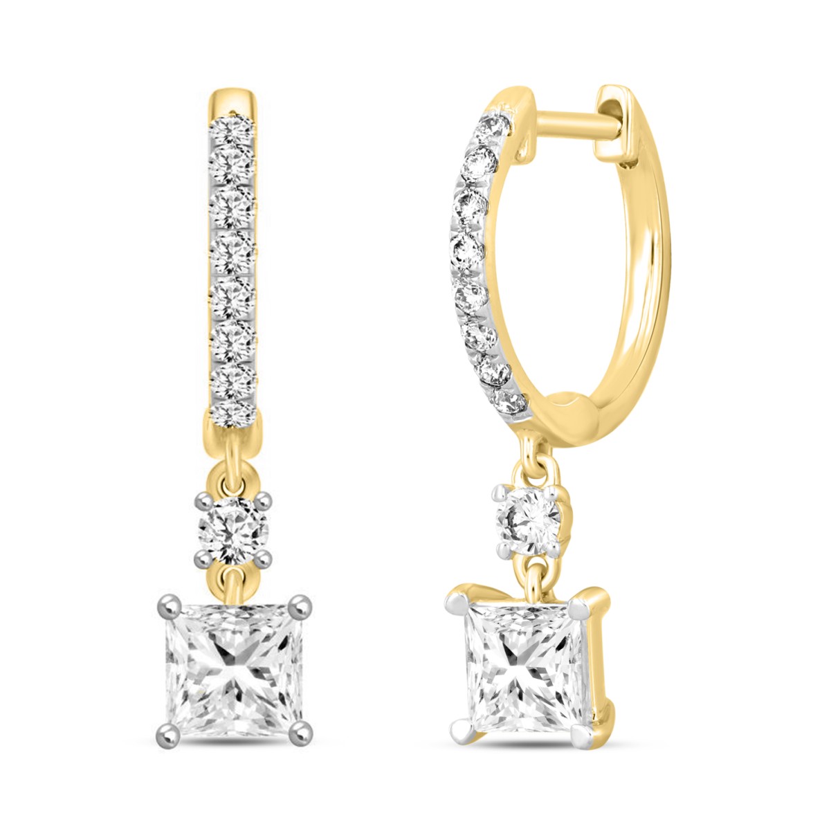 LADIES EARRINGS 1 1/4CT PRINCESS/ROUND DIAMOND 14K YELLOW GOLD (CENTER STONE PRINCESS DIAMOND 1CT)