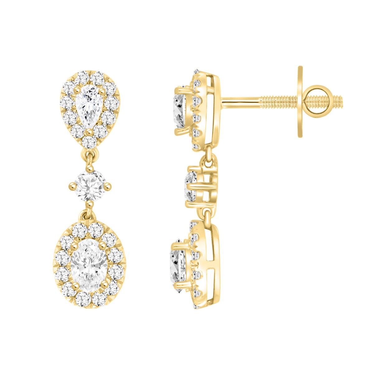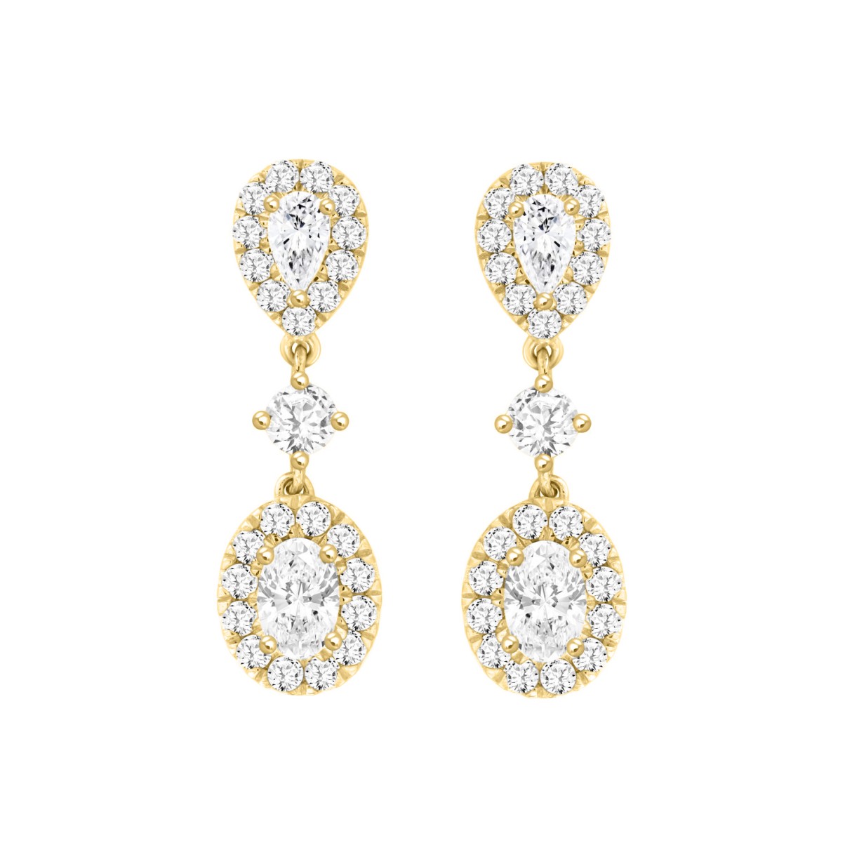 LADIES EARRINGS 2 3/4CT ROUND/OVAL/PEAR DIAMOND 14K YELLOW GOLD (CENTER STONE OVAL DIAMOND 1CT )