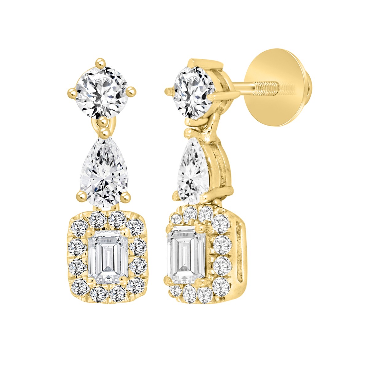 LADIES EARRINGS 2CT ROUND/EMERALD/PEAR DIAMOND 14K YELLOW GOLD (CENTER STONE EMERALD DIAMOND 1/2CT )