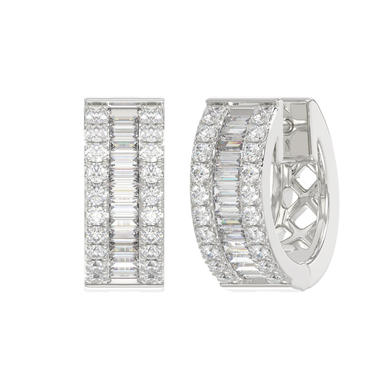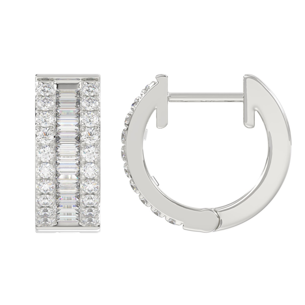 LADIES HOOP EARRINGS 3/8CT ROUND/BAGUETTE DIAMOND 14K WHITE GOLD