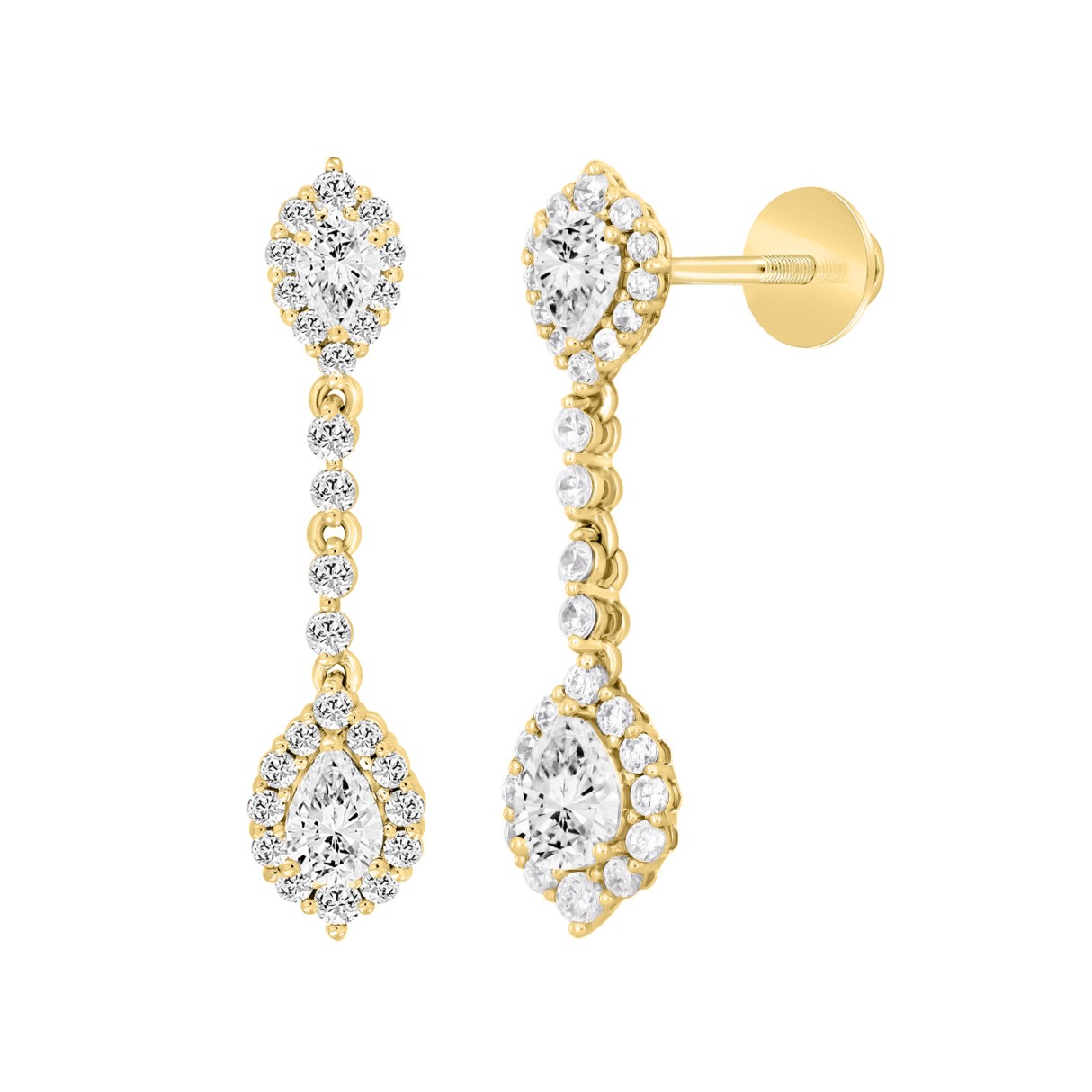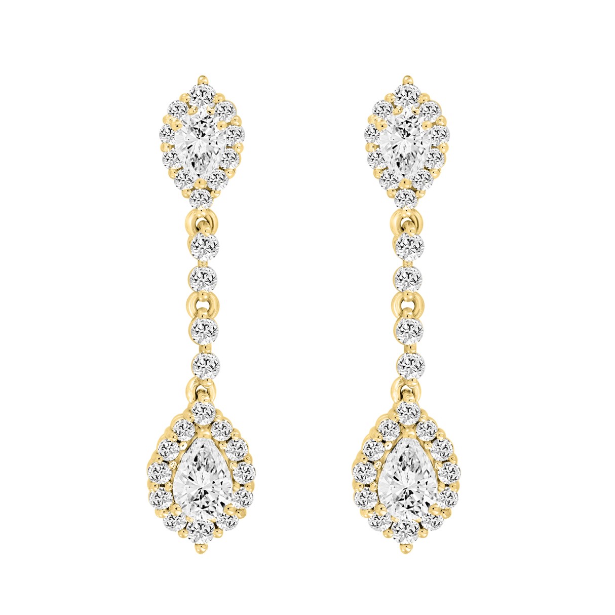 LADIES LINEAR EARRINGS 2 3/4CT PEAR/ROUND DIAMOND 14K YELLOW GOLD (CENTER STONE PEAR DIAMOND 1CT )