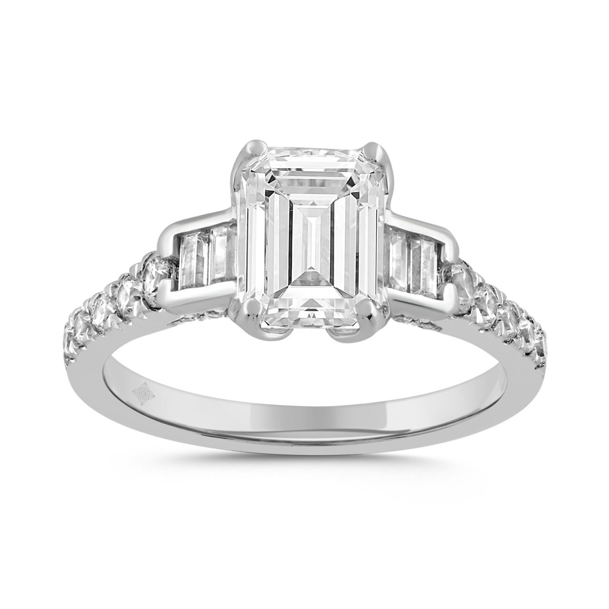 LADIES RING 3CT ROUND/BAGUETTE/EMERALD DIAMOND 14K WHITE GOLD (CENTER STONE EMERALD DIAMOND 2CT )