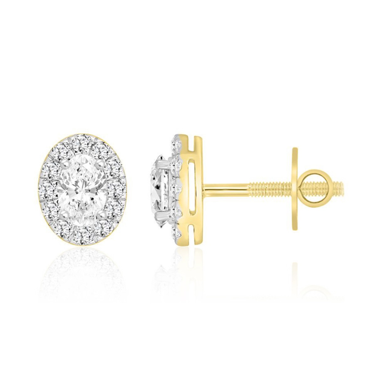 LADIES STUD EARRINGS 1CT OVAL/ROUND DIAMOND 14K YELLOW GOLD